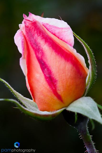 Light: diffused is usually better. I try to find flowers in the shade or in a bright room outside of direct sunlight. This allows the colors to really shine and does not create distracting harsh shadows. Soft light just seems to go better with the nature of flowers. In this image of a rose bud I positioned myself so the light would bounce off of the back petals.