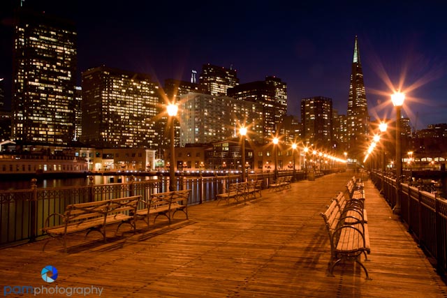 This photograph of the San Francisco skyline at night, was taken on Pier 7, a location highlighted in the PhotoSecrets book.