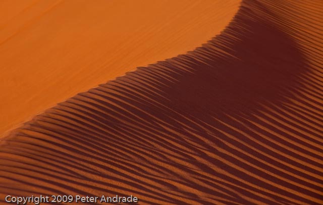 Always inter-related to the issue of exposure is light. In fact, I was not sure if I should start with the issue of light or the issue of exposure since they are intimately intertwined. Like all landscape photography, early morning and late afternoon light is best, even more so here, not just because of the yellow color of the light, but because of side lighting. The golden color of sunrise and sunset light will show well on any color dunes, but the side light will also produce sand ripple shadows that are not apparent in bright daylight with the sun directly overhead. Also, side light creates deep shadows in dunes that create a contrast between the sand dune and the sand dune’s shadow creating dramatic shots. In contrast, overcast days may be good for flower macro shooting, but do not produce side lighting for the classic sand dune and ripples shot. In fact, the biggest disappoints I have had are overcast days in the middle of a beautiful dune field.