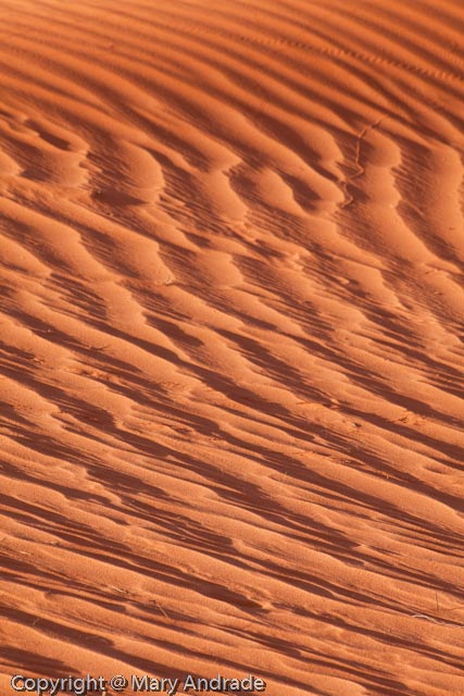 Most of the time, I hate to see any kind of foot prints in the sand, but sometimes the footprints, whether man or beast, make a great leading line. Use them. Finally, look for natural abstracts in the shapes, patterns, and shadows. Mary is particularly good about spotting these.