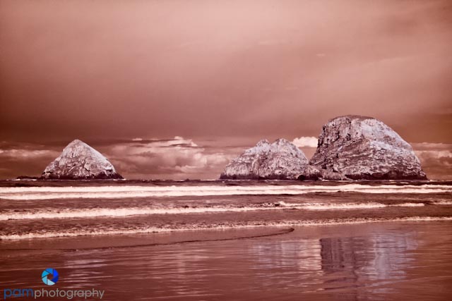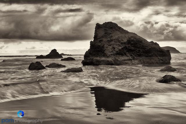 Mary and I drove down the Oregon Coast with Jack Graham a few weeks ago. I already blogged about the lighthouses and barns. This edition will be about photographing the beaches and coast line. Again, we started in Tillamook and drove down to Bandon over three days. There are several Oregon coast iconic shots. One of them is a synedoche for all of it – the “seastacks” that are prominent along the coast. These are in Oceanside, OR.