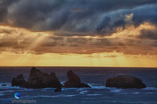 We saw a few good sunsets, but nothing spectacular. However, we experienced one sun set in three stages in Bandon. The first was with the sun in and above a bank of clouds on the horizon, which provided some interesting light. Next the sun broke through the clouds and hung on the horizon, but was too bright to shoot directly. Here we recomposed and just waited and enjoyed “seeing” the sunset. Lastly, as the sun went below the horizon, we got another chance to shoot as the light bounced off of the clouds.