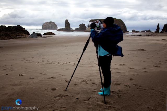 Shooting conditions were pretty rough as it rained or misted on us pretty regularly and the wind was howling. We needed rain gear and water covers for our cameras on a couple of occasions. It also helped to have a heavy tripod and weigh it down with a backpack. We shot directly on the beach a few times at Bandon to get some close-ups of the seastacks.