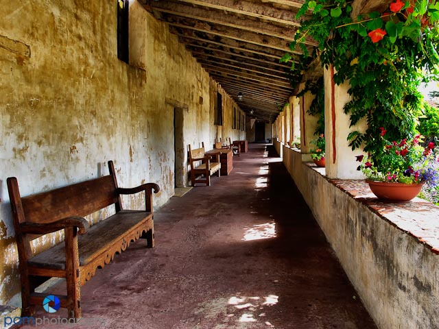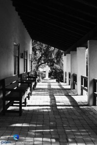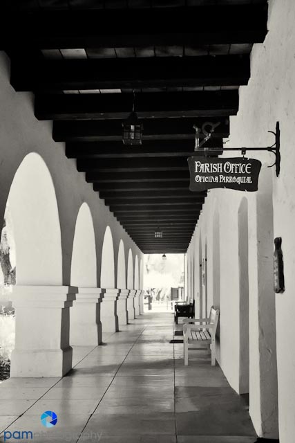 Every mission we have seen has beautiful porches that are quite inviting. They always have nice wooden benches and are long, therefore being a great subject to show perspective. You have a couple of choices about angles and light. I usually like a bench in the foreground to create a strong subject and then let the photo run out.