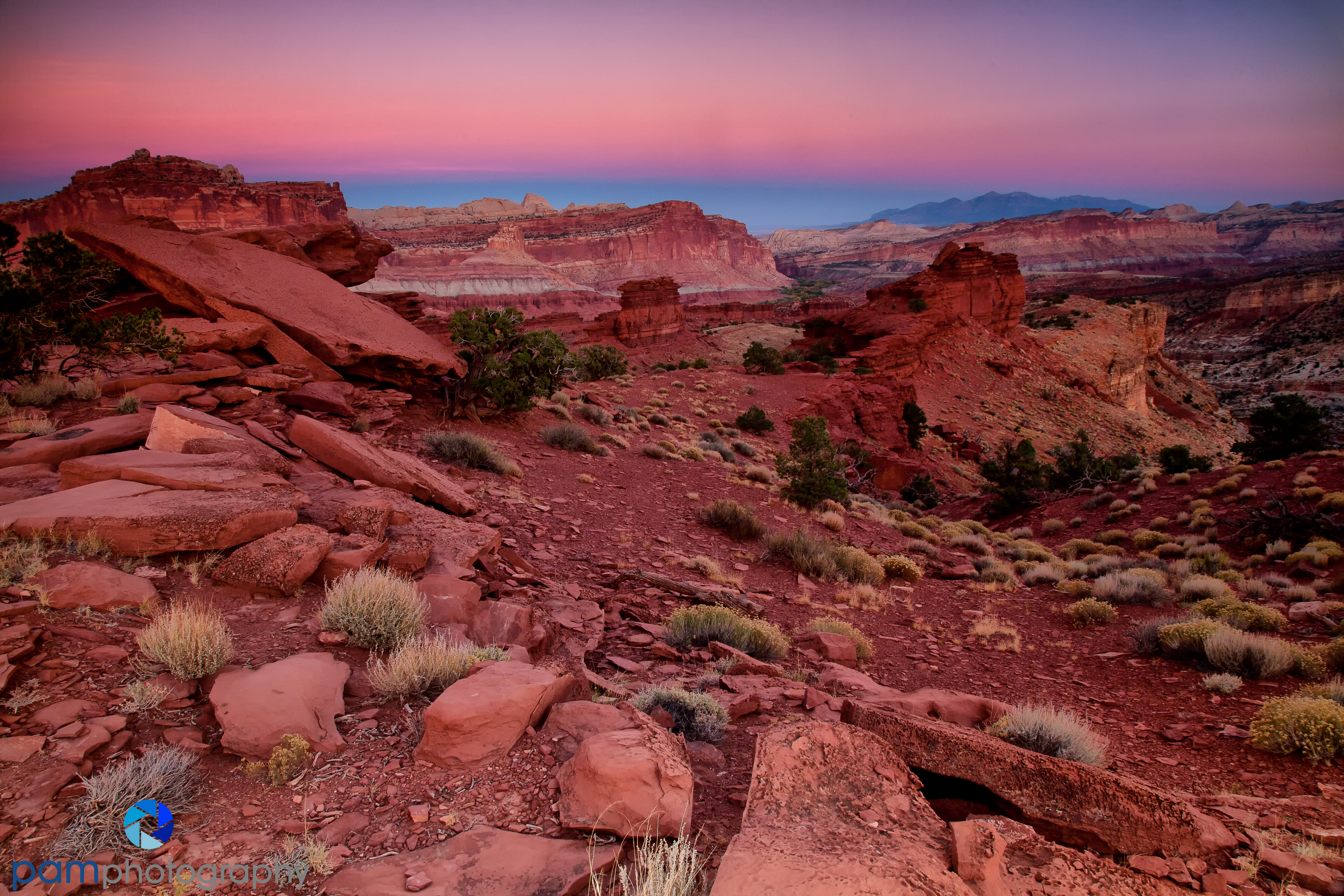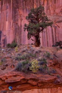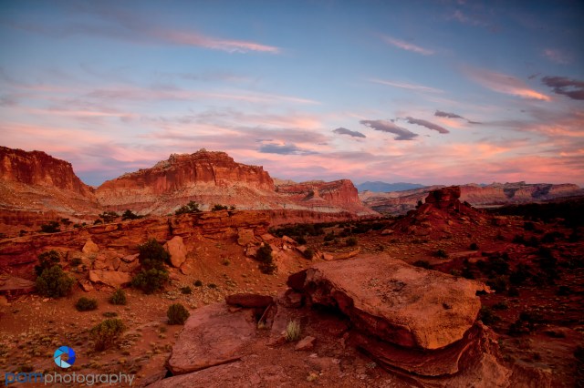 The little town of Torrey, UT is the gateway to Capitol Reef. It is easy to drive in and out of the park from your hotel there. These two points are right next to each other and not more than 15 minutes from town. We shot Goosenecks Overlook twice and and Panorama Point twice. Most of the roads in Capitol Reef involve some kind of well groomed dirt road. After driving up a small dirt road you end up on a point looking east – Goosenecks Overlook, and one looking west – Panorama Point. As you can see the dominate colors are red and pink sandstone with some small green pinion and juniper trees known as a pygmy forest.