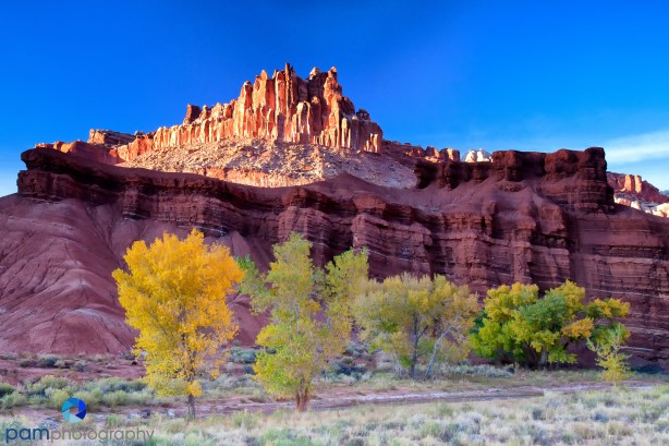 Across the street from the Visitor’s Center above you looking southwest is The Castle. There is a small creek, several cottonwood trees, and a grassy meadow. We shot this area a few times. It can look good in the morning – after you finish sunrise and also in the afternoon before you shoot sunset.