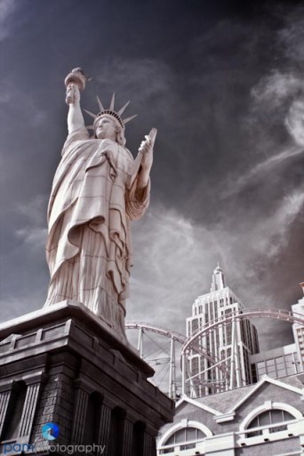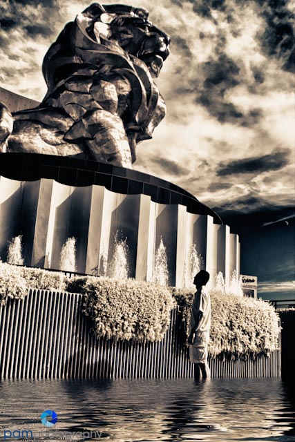 Lastly, MGM has the giant golden lion on the corner of Las Vegas Boulevard and Tropicana Avenue. Mary used her infrared and a “flood” filter to create this unique photo.