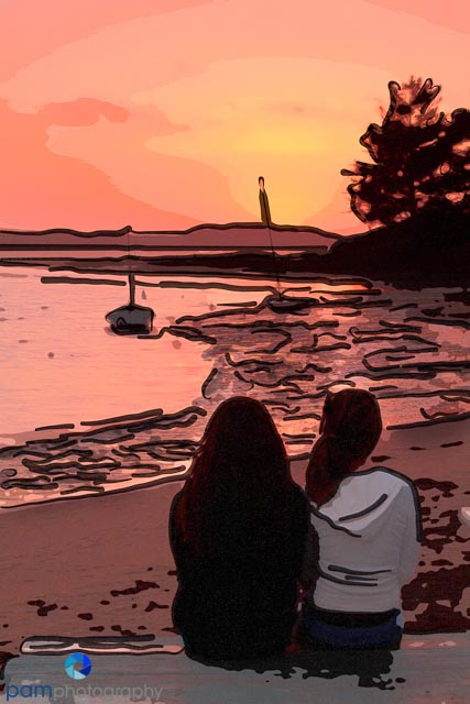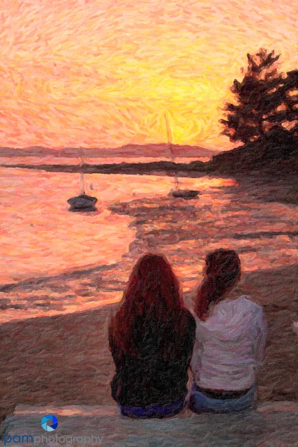I know this may sound obvious, but typically I look at a subject as either “fine-art”, “pop-art”, or with graphic possibilities. During the class I would pick a favorite photo and try many different treatments to see the range of effects and feelings. This photo below is of two teenager sisters sitting quietly watching a sunset (I know seemingly implausible). One interpretation uses Snap Art’s oil painting preset, the other uses the Stylize preset. One could be placed on a wall, the other a postcard.