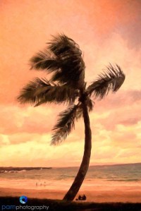 Peter and I were hoping for a beautiful beach sunset – it was just not going to happen. I loved this palm tree and the two people sitting on the beach hoping for the same thing we were. It was cold, windy, and sometimes rainy. I ran the photo through Topaz Adjust 5 to create the yellow vintage look (more to come on that software in a different post), and then took it into Snap Art and used an Oil Paint preset. This was what I wish we had seen on the beach that night.