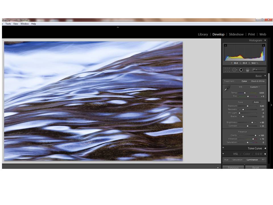 I make a series of basic adjustments using the righthand panel of Lightroom. I start at the top and then work my way through to the Vibrance adjustment. Adjustments I typically make include: