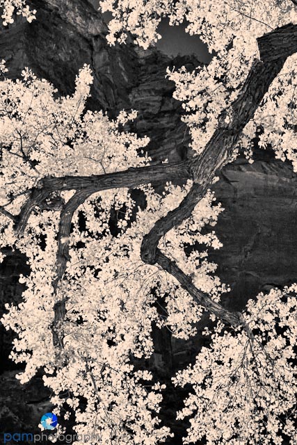 This last image was taken using my infrared camera. It was a beautiful cottonwood displaying vibrant yellow foliage. This rose colored tone helps accentuate the foliage against the rough cliff.