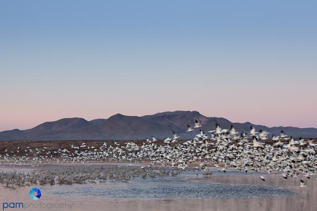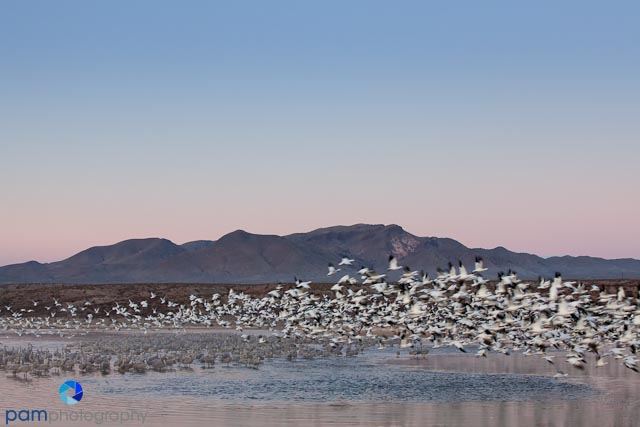 The highlight of any trip to the refuge is the morning “blast-off.” This is the moment when hundreds, if not thousands, of birds, take off at once to start their day. Blast off begins quite early in the morning around sunrise, so like any good nature photographer, you have to get there early, stake out your spot, and prepare for the inevitable. We photographed two blastoffs and learned different things each time.