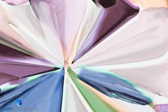 To create the abstract I removed the large bubble in the blue piece of glass, applied Photoshop’s pinch filter a few times, copied the image to additional layers and rotated them to fill in the open spaces, and then finally applied Flaming Pear’s Aetherize filter. The end result reminds me of a watercolor.