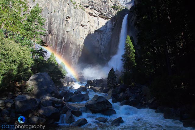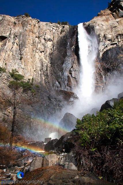 The best thing about spring are the dramatic waterfalls. I was able to catch “waterfall rainbows” at the Lower Yosemite Falls in the morning, Upper Yosemite Falls in the mid-morning, and Bridalveil Falls in the afternoon. One caveat here – the spray was significant – almost raining, so trying to get a decent photo in these conditions is difficult.