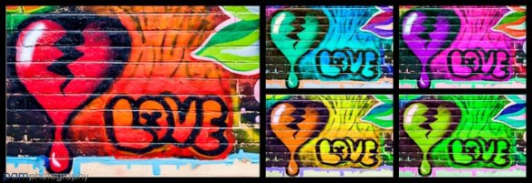 - It’s better if you isolate and photograph a small discrete subject in the street art. Like the heart above – it’s easier to make it stand out when you vary the color scheme. Here is the alleyway where most of the images for my collages came from – it was over a block long with murals along the entire length and in the doorways.