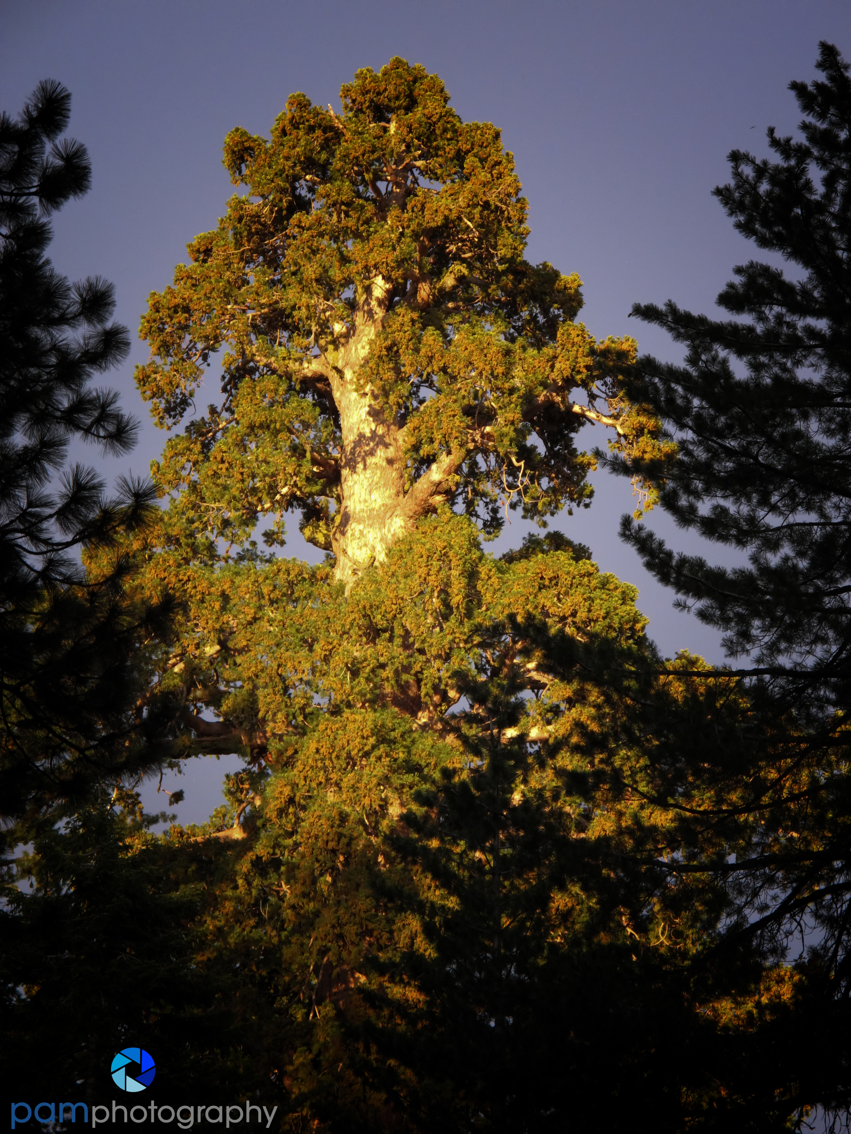 Tall trees are hard to shoot. Very tall trees and very large trees like Giant Sequoias are especially hard. Don’t try to shoot the whole tree, but parts of it. In this case, it was early morning and the sun had lit up the top of the tree, while the much smaller pine trees below it were in complete shade. I positioned myself so that the smaller trees were completely in silhouette. Chiaroscuro is an artistic technique to put light on only a portion of a photo or painting as made famous by Renaissance painters.