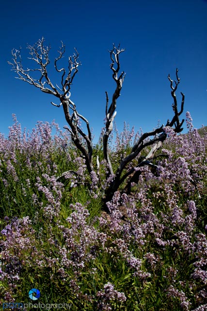 A couple of years ago, we had a pretty bad fire in the Angeles National Forest above Pasadena and the San Gabriel Valley. In the spring, the road opened and there was an explosion of wild flowers in a pretty desolate setting of burned out trees and black hills. We found these flowers intermixed with a burned out manzanita tree. I think the bright light and clear sky along with the wild flowers are a great contrast to the dead burned out tree.