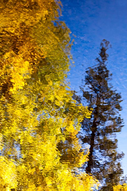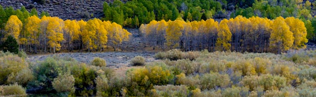 Here is a 5-shot panoramic of some Aspens. We were on a road and getting real close was not an option and in front of and above the Aspens was pretty boring. A wide-angle shot and/or a panorama seemed just right to capture this yellow grove with some green trees behind it.