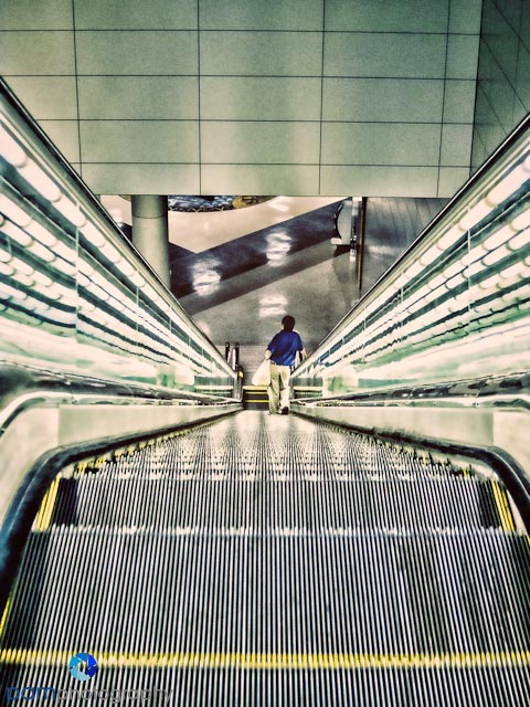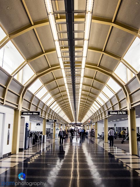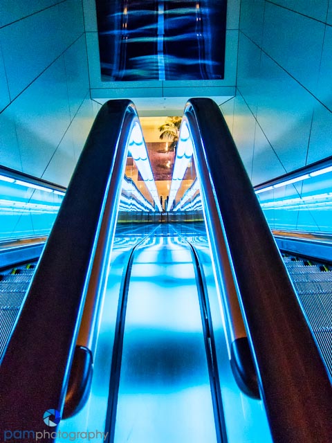 I found myself abstracting the mundane and monotonous into graceful lines and curves. Ironically I did not like the images where I zoomed in (my preferred “see-zone”). I honed in on the lines to create a vanishing point, and watched the reflections on the floor to see if there was a mirror effect or anything else that was interesting. I found symmetry worked best for most images – instead of asymmetrical compositions. I loved playing with my new actions and effects and found they lent a surreal quality to each image – much like what I was feeling, wondering through the airports after a long day, late at night.