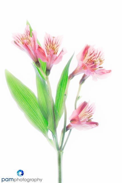 The technique is by Harold Davis and is described in his book Photographing Flowers. His image really appealed to me, it was like a painting, but also a 3-D image at the same time. He lights his subject from below and above, and then takes multiple exposures until he gets a pure white image. For this project I used a Lightpad, a macro lens, my $10 goose neck desk lamp (and sometimes my flash). I really wished I would have been more diligent about using my polarizer to remove the glare from the leaves.