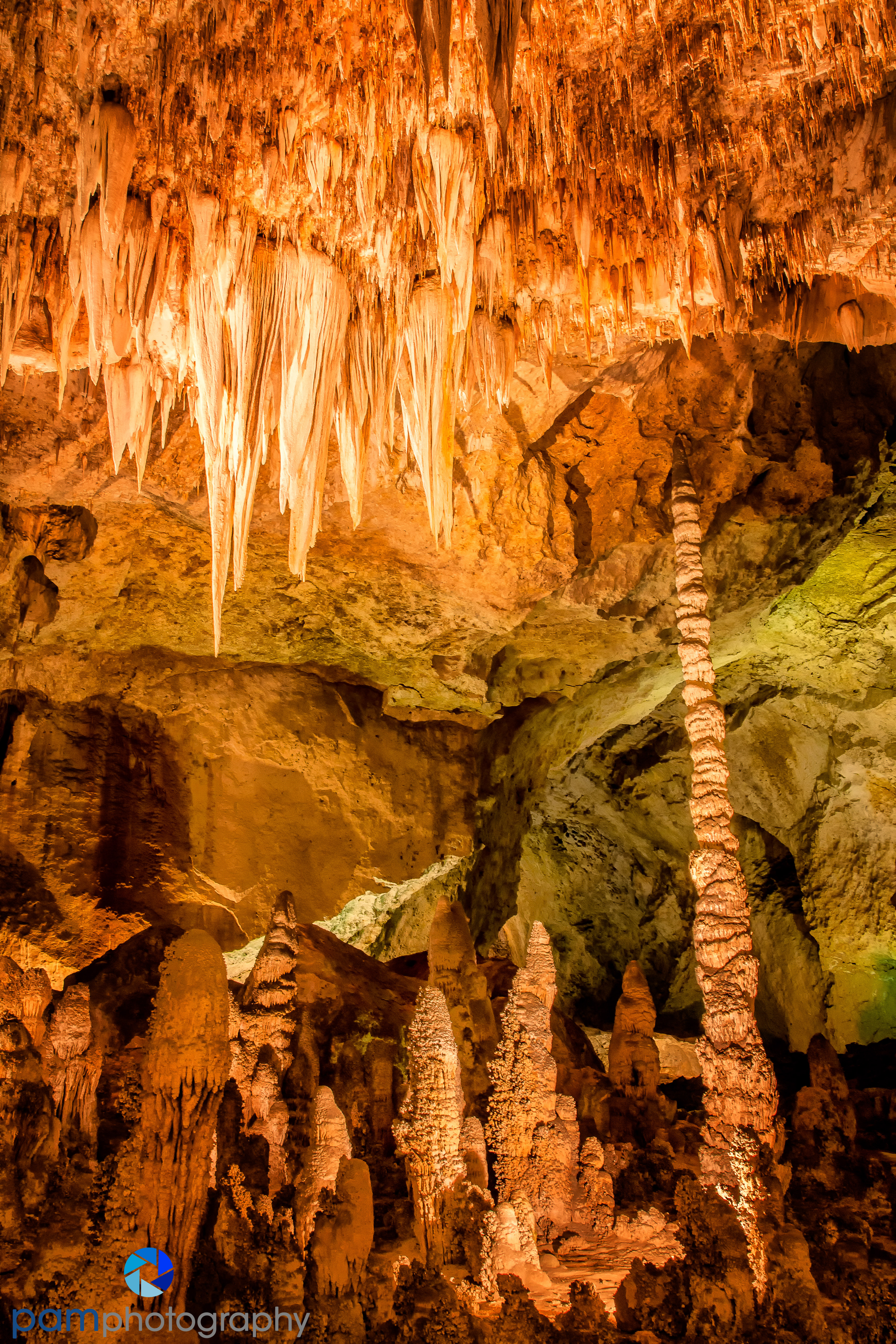 This should be obvious, but you can not tell by these photos, the cave is very dark. All of the photos here were shot at 800-1000 ISO, f/16, and shutter speeds of 10-30 seconds. There is ambient light from many foot lights and spot lights, but a point and shoot with flash will look radically different than these. Your eyes can not see all of this color – the gold, green, and yellow – but your camera can with a long exposure.