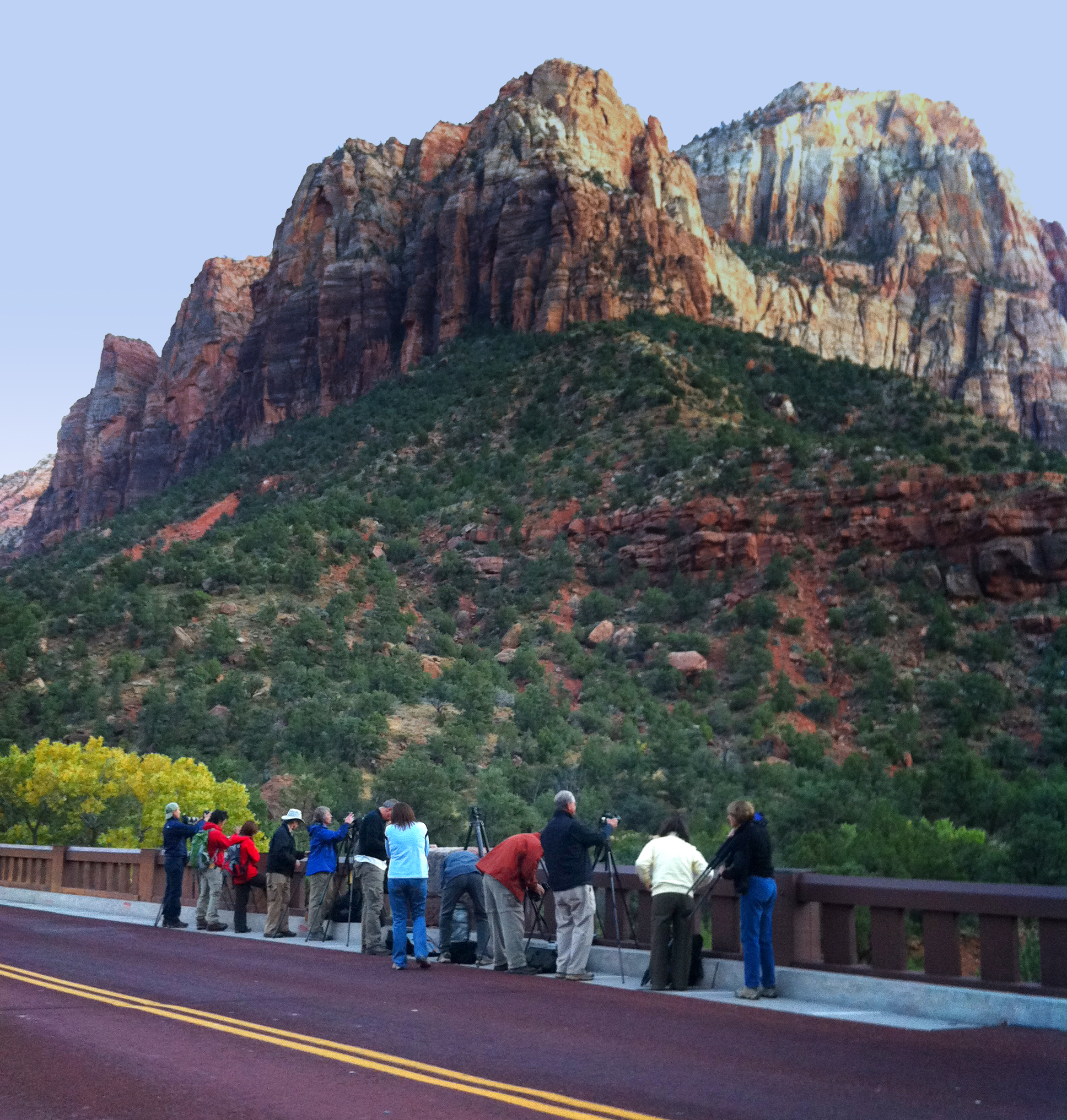 There is a small parking lot – only room for five cars or so, but there is a bus stop right across the street and a parking lot about a mile away. There is 2-3 really good positions on the right side, and about 15 others. The left side is not good at all. This is a sunset shoot and is the iconic photo of the Watchman, so it is really popular and crowded. It is on an active street and the Rangers really police you to stay off of the street. If you do not get here an hour or more before sunset, you do not get the shot. Tense, but manageable.