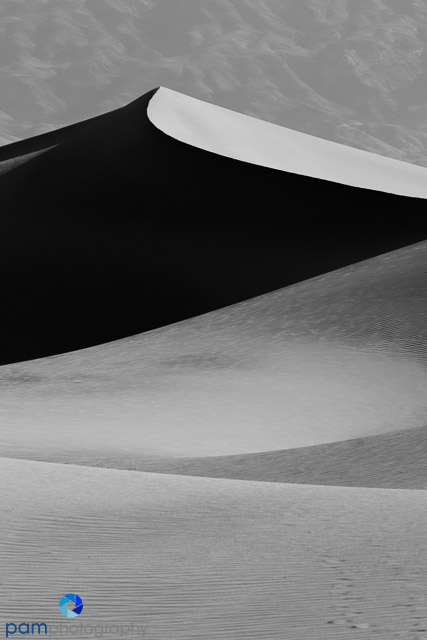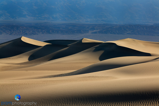 When we were in Death Valley a couple of weeks ago, Mary and I walked southeast from the parking lot at the Mesquite Dunes near Stovepipe Wells. Most people walk straight at the largest dunes and climb them. As a photographer, we wanted, and needed clean dunes and these were off to the right. If you have never walked in the desert, you may not know how hard it is to judge distance. The dunes always look so close, but are often times a mile or more away from you. We stopped a ways back and used our telephotos.
