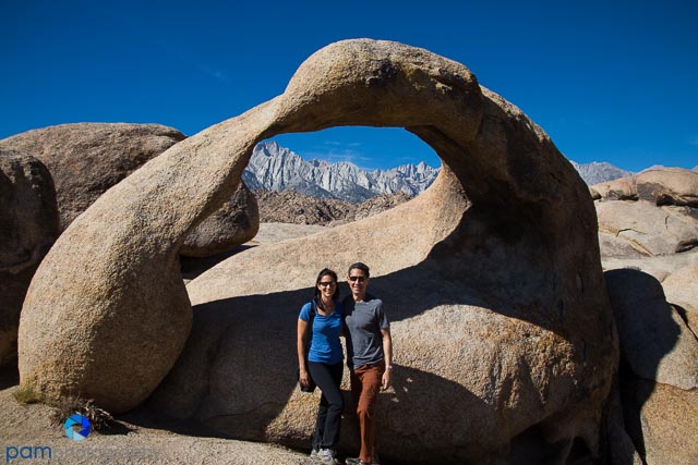 The Mobius Arch is a just a few yards away down the trail walking east. There is a lot more room to work with, but I still don’t think you can get more than three people in the right position to get this composition where you have both Lone Pine Peak and Mount Whitney in the arch. When Mary and I were there, we had to fight it out with a few people. Most tourists want a photo of themselves in the middle of the arch, so some sharing and patience is required.