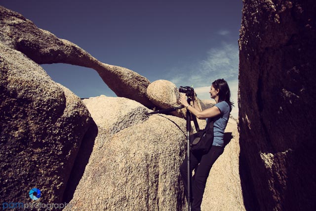 Mary was shooting infrared and needed the stability of a tripod. I also planned to make the final photo black and white anyway. The key to this composition is creating space above the arch for some sky and between the mountains and the arch. That is why you have to get into the tight space or lie down. We had a bald sky, so I used a red filter to turn the sky black and really pull out the texture of the arch.