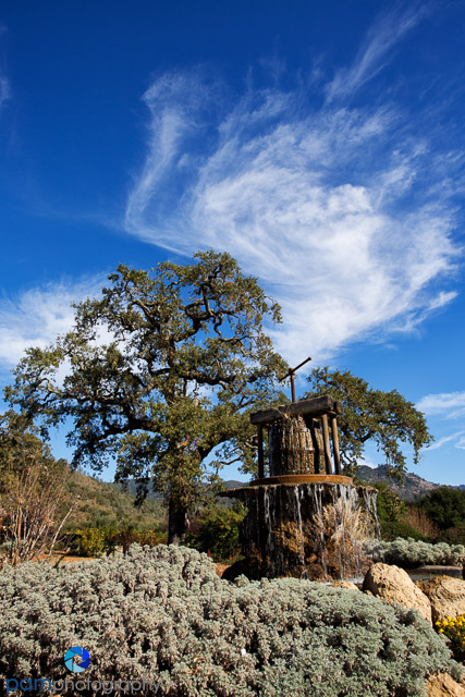 B Cellars is across the street from our hotel, so I knew I could get grape vines as a foreground with the sun behind me. As we had driven by B Cellars a half dozen times, I had also noticed the interesting fountain in front of the winery tasting room.