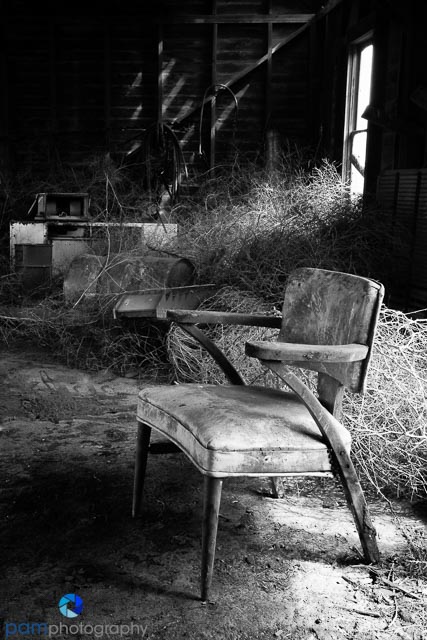 Old chair in barn – horizontal and vertical, warm tone and black and white
