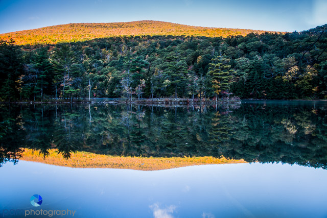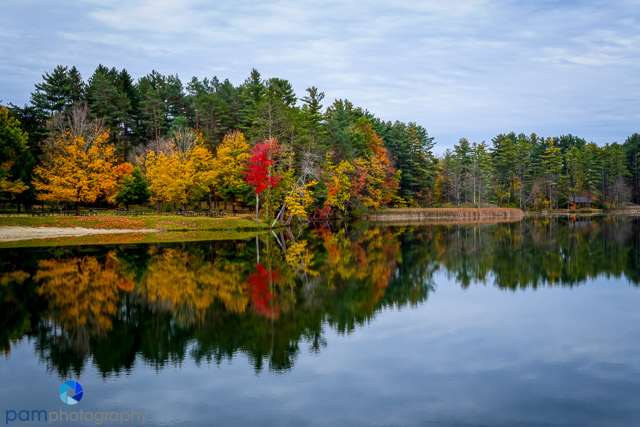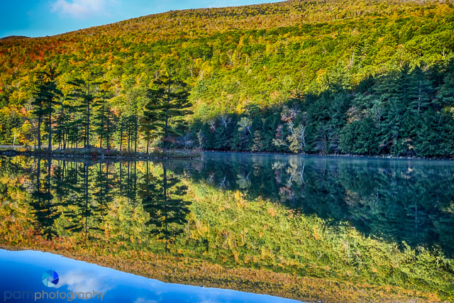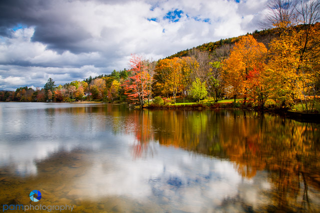 One of great joys of nature photographing is finding and making photos of reflections in lakes. You must have great subjects to make a great photo. We found plenty of fall color along the many lakes and ponds in Vermont. Here are some of our favorites: There are two keys to making these types of photos. First, you need a windless day so that the water is flat and glassy. Usually, dawn is the calmest time of the day. Second, the timing has to be right so that the “subject” is lit, but the water is still in shadow. This means you need the right time of day and the sun has to be behind you. There are a few issues to deal with. The toughest one is exposure. When you include the sky and the water along with shadows and highlights, you will need to use a graduated neutral density filter, and/or high dynamic range (HDR) processing.