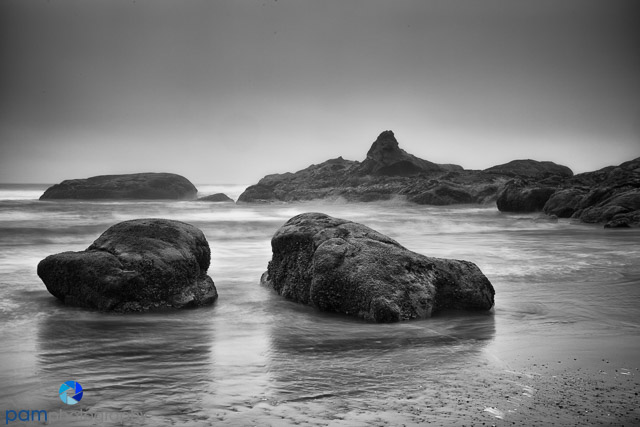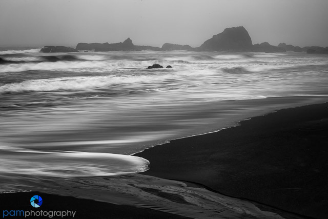 The sand was not black, per se, but was quite dark. In processing these in Nik’s SIlverEffects Pro, we set the black and white points which created really nice contrast between the black sand and white water.