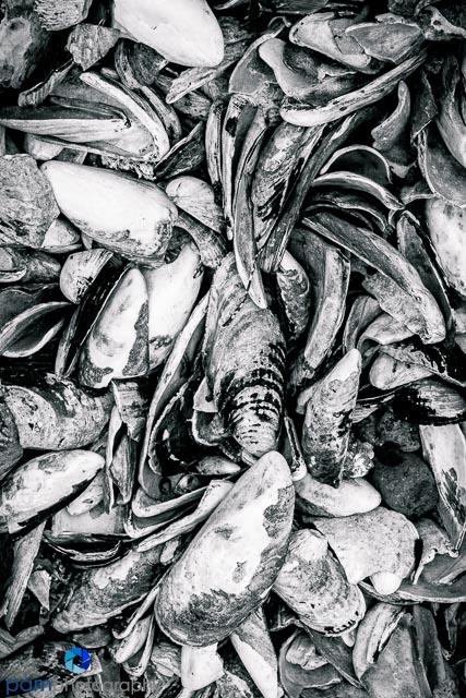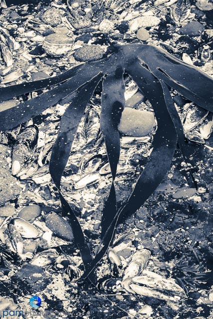 Instead of looking for “stuff” (i.e. star fish), I started focusing on shapes and colors. When I encountered glare I could not polarize out of the image, I tried to see it as “white” and work it into my abstracts. I stopped cursing the kelp, and started to look more closely at the patterns patterns. I tried to see beauty in the shapes and patterns of the mussles, rather than seeing an eye sore.