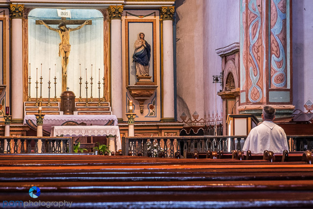 Because it is pretty dark inside, the interior photos can have shutter speeds in excess of 5 seconds, so you need a tripod and “still” models. The priest in the cover photo sat still, praying for 20+ minutes. Tourists came and went along the altar, while Mary and I waited for the perfect opportunity, which finally came. I usually don’t want people in my photos, but sometimes the perfect figure makes the shot.