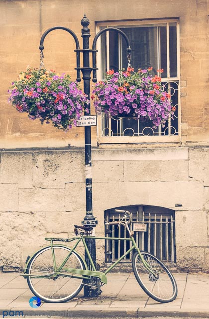 I was in a college town, there were a ton of bikes, and yet they kept capturing my attention. I finally stopped and spent some time “working the scene” to figure out what made bikes here in Oxford so unique. It wasn’t really the bike, but the environment in which people bike….old buildings, fresh flowers, crumbling walls……If I was using my trusty telephoto, it would not have been wide enough to capture this scene.