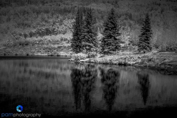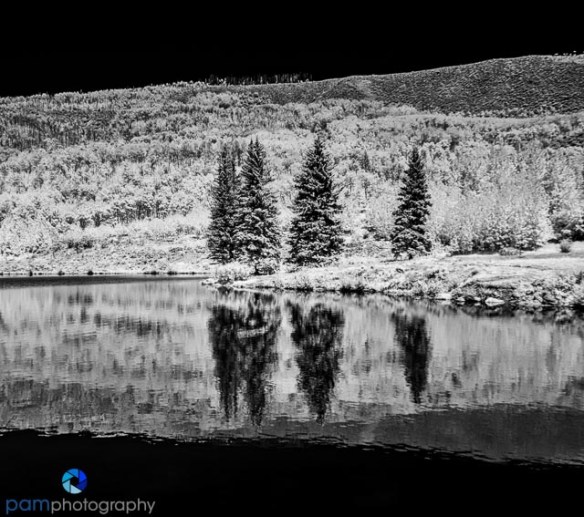 As were were hiking around the lake on a “family hike” with our infrared point and shoots, we both saw this obvious scene. What attracted us was the trees and the reflection. I was so focused on the trees and reflection, that I did not “see” the opportunity to include the sky as a “framing tool.”