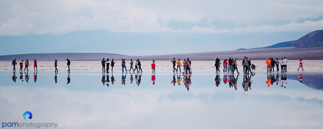 Photographing Badwater was frustrating for me. The sky never opened up into dramatic color, and it was full of loud excited people. Typically I photograph a nature scene symmetrically reflected in water. But I wasn’t feeling it. I decided to embrace the people. There was something about the lone woman in orange standing in the middle of the crowd just looking around that caught my attention. I also created an image of just the reflection of the mountain and rotated it so it looked more like a textured image.