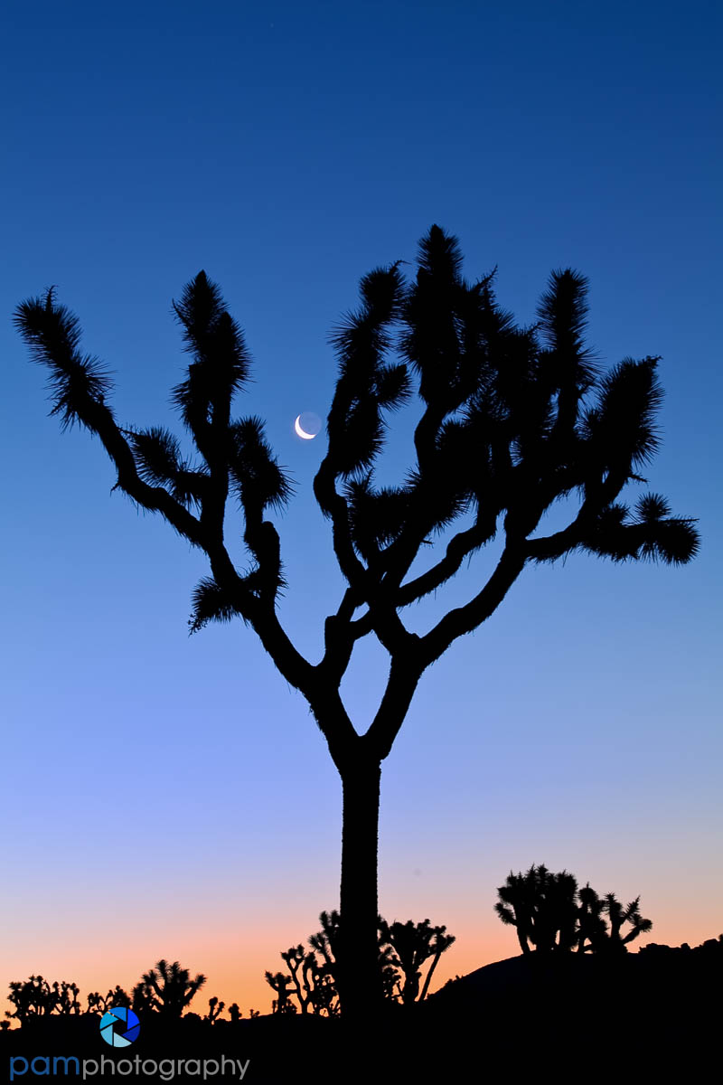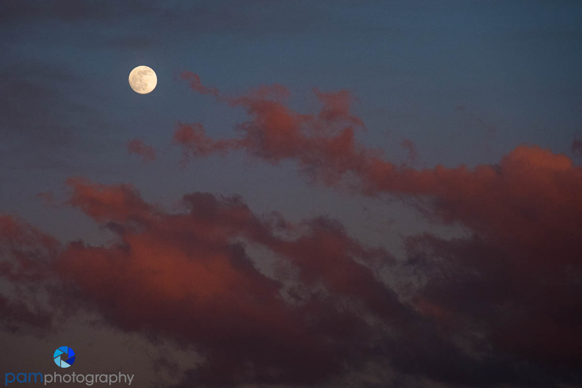 Many professional photographers plan their photography workshops around the full moon. Most times you get to experience a moon rise shot in the late afternoon and a moon set shot just before dawn, maybe twice in the month, the day of the full moon and maybe the next day, too. I plan my month based on the full moon schedule. If we can be on the road and make a moon photo, I plan for the composition and timing. If we are at home, I am lucky, as I can photograph the moon rise from my back yard and the moon set from my front yard. Moon sets from my front yard, below.