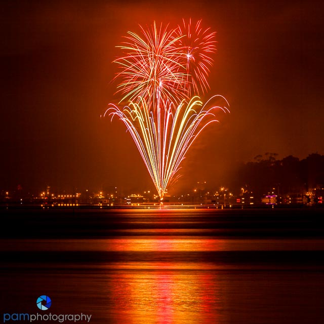 In three of the photos above, we were able to get a nice reflection in a river and in a bay. If you can be near water, this makes for a really nice image. If you are not near water, try to find some kind of foreground silhouette to add interest (even if it is your child’s head). If you can’t do either, make sure to get the fireworks within the frame and not have a lot of leakage out of the frame.