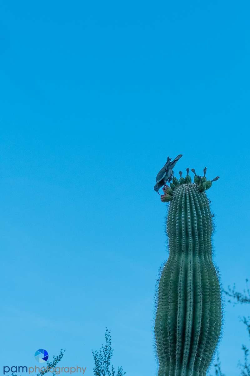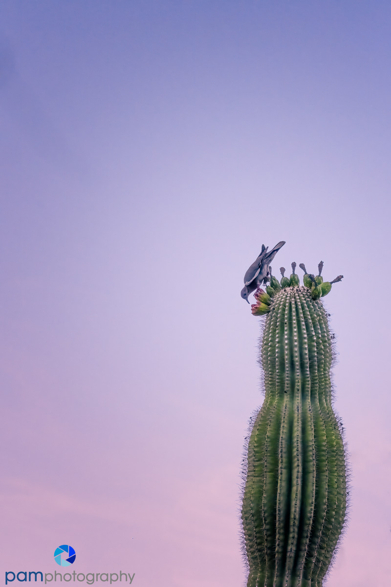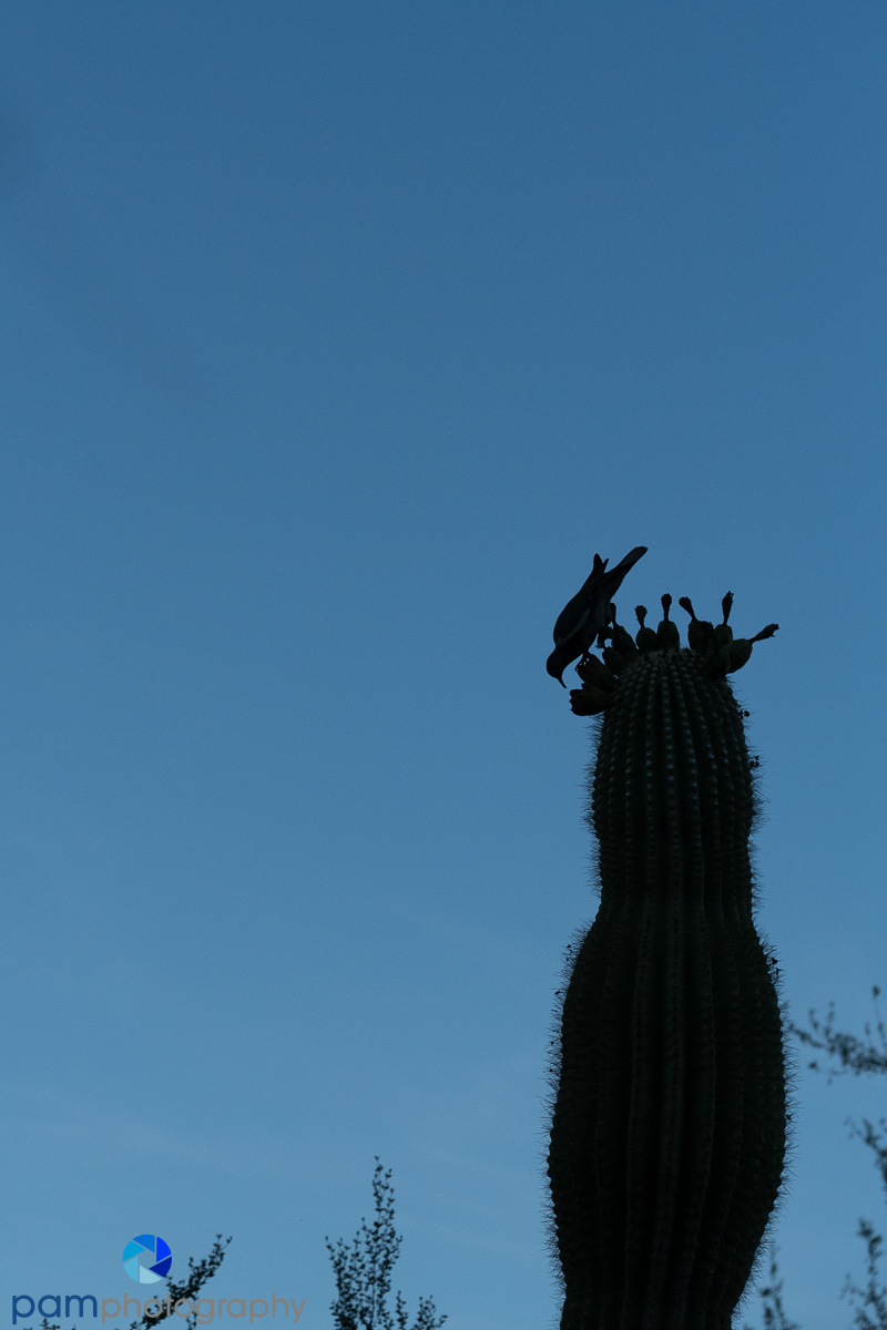 My initial capture was late in the day at the Desert Botanical Garden in Phoenix. I initially thought I would create an image with a blue sky, and a silhouette of the bird and saguaro.