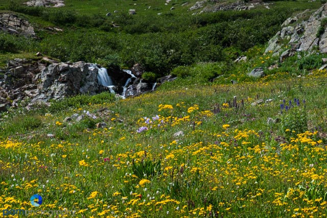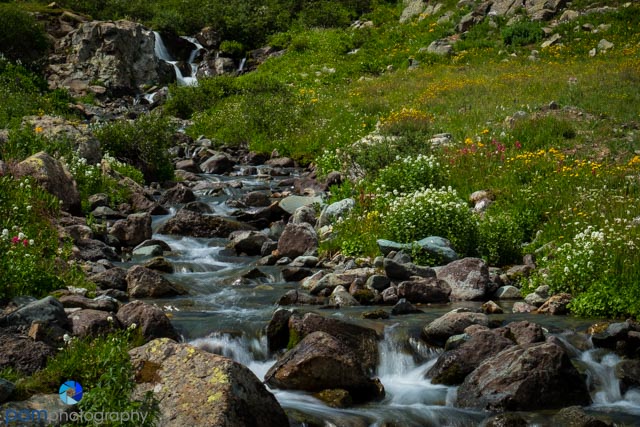 We have just a few short tips for photographing the basin. It’s visually stunning and contains many of the elements that make Colorado so beautiful: mountain peaks, waterfalls, streams, and wildflowers. Having all of these visual elements can make it difficult to compose an image and capture the beauty of the environment. We took over 100 images, and kept about 10. The conditions were challenging, the sun would duck in and out of the clouds, and at times the wind picked up and blew the flowers around. It was difficult to slow the shutter to get milky smooth water in the waterfalls, and sharp flowers in the foreground. We both agreed we’d like to go back and try to capture the basin in better light.