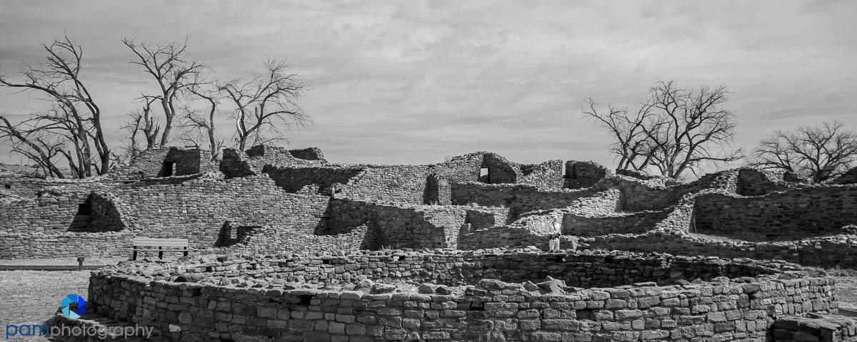 We used Farmington, NM as our home base for exploring northern New Mexico with stops at Shiprock, Chaco Canyon, and the Bisti Badlands. Thirty minutes outside of Farmington is a fabulous small National Monument with a large pueblo and some reconstructed buildings. It also has one of the longest hallways in any pueblo in the west and we had to see it. Here’s what you might see at the Aztec Ruins National Monument.