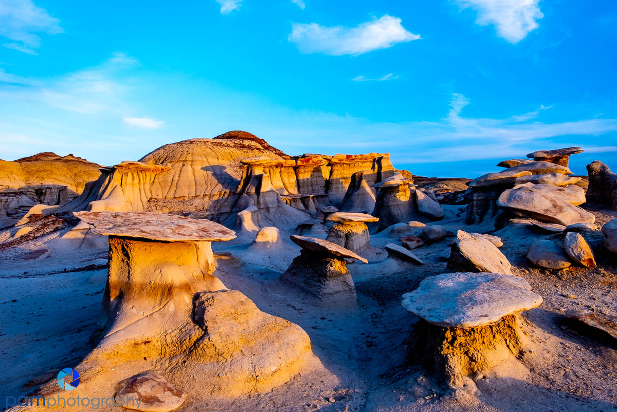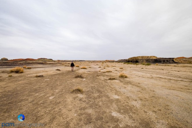 If you don’t want to dry camp, then stay in Farmington, NM which is about an hour away from the parking area. There are two entrances into the Bisti Badlands. I would suggest the South entrance at the Alamo wash (main wash or big wash) which has a toilet, large parking lot, and room to camp overnight, if you want to. The Alamo Wash runs pretty much east/west and is very wide. It is the way in and the way out. All of the little washes run into it, so if you get lost go down hill towards this wash and you can make it out. It’s easy to get lost because the little washes and hills blend together. Oh, and there are two barb wire fences that mark the south and east boundaries of the Badlands. If you get on the wrong side of the fences, you will be stuck…more on that later. Carry a GPS if you have one and we also found the All Trails App useful.