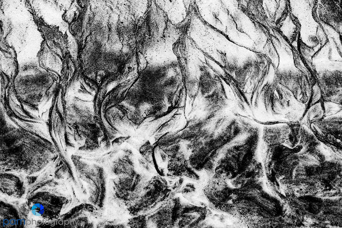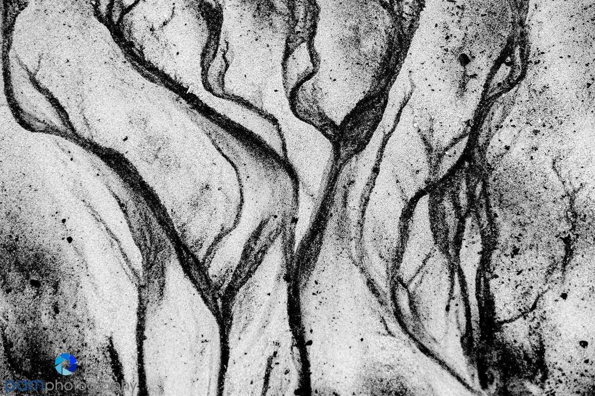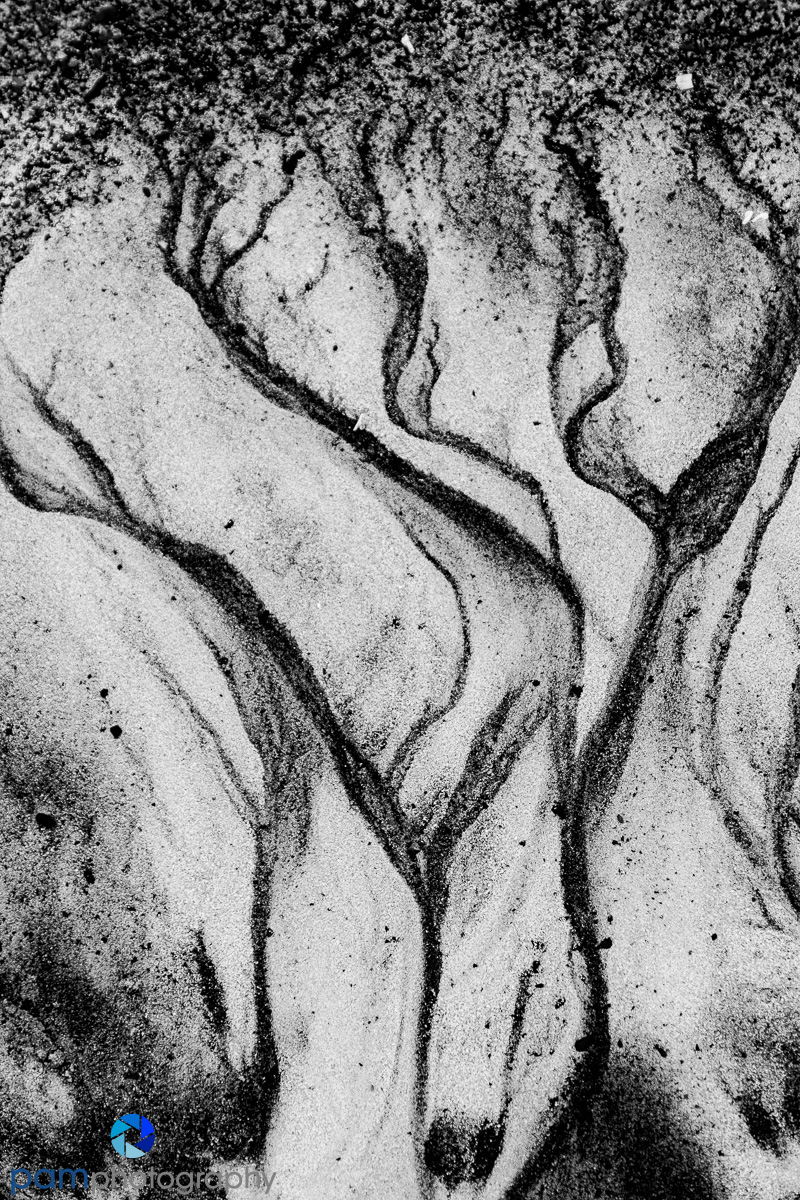 The shapes, lines, and patterns water makes on the sand is fascinating. I can walk on a beach for hours and not look up. If you have an opportunity to photograph on the beach, find an ugly spot that looks “dirty” and then try to isolate a dominant shape and create compositions with that shape in different areas. Sometimes I will look for a rock that breaks up the pattern and create the composition around that subject. I find high contrast monochrome images help emphasize shape and pattern, and de-emphasize the fact that I am photographing dirt patterns in the sand.