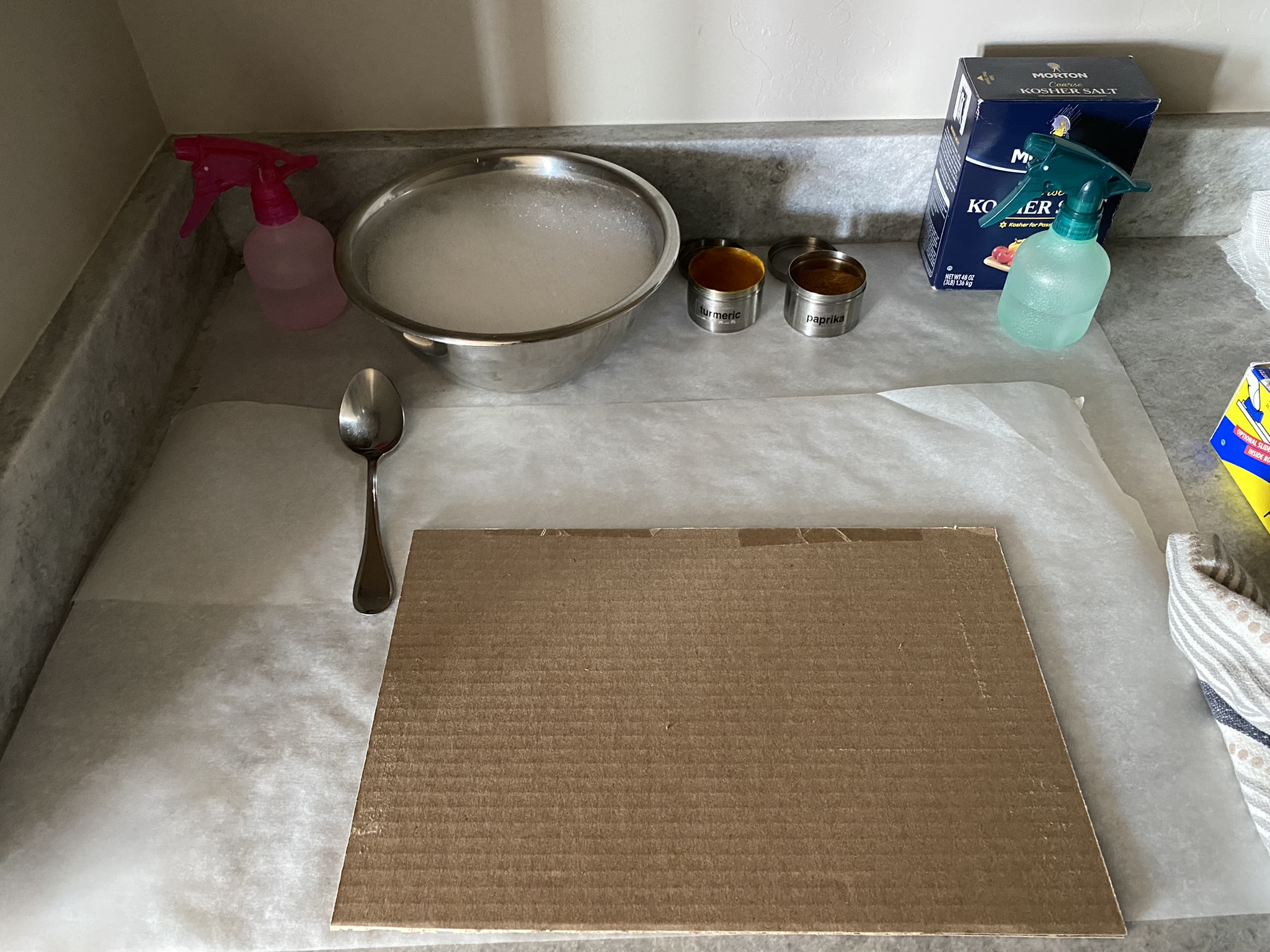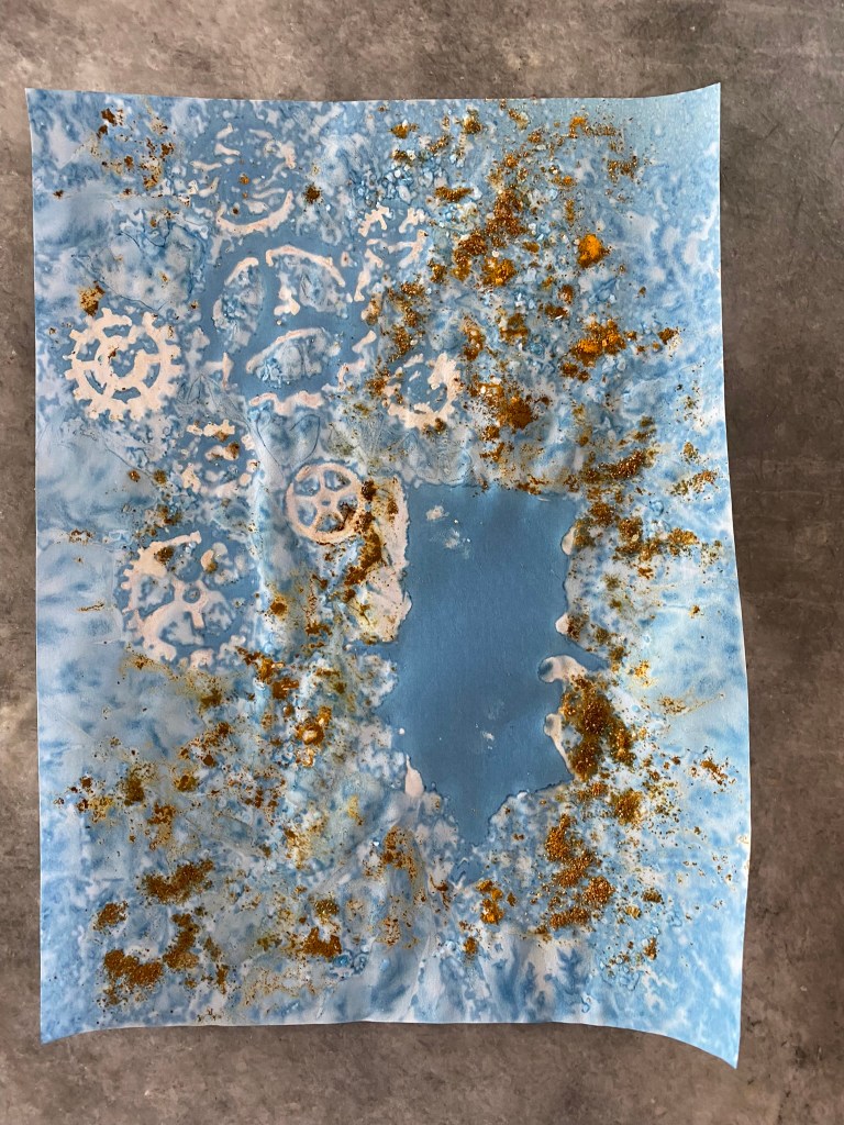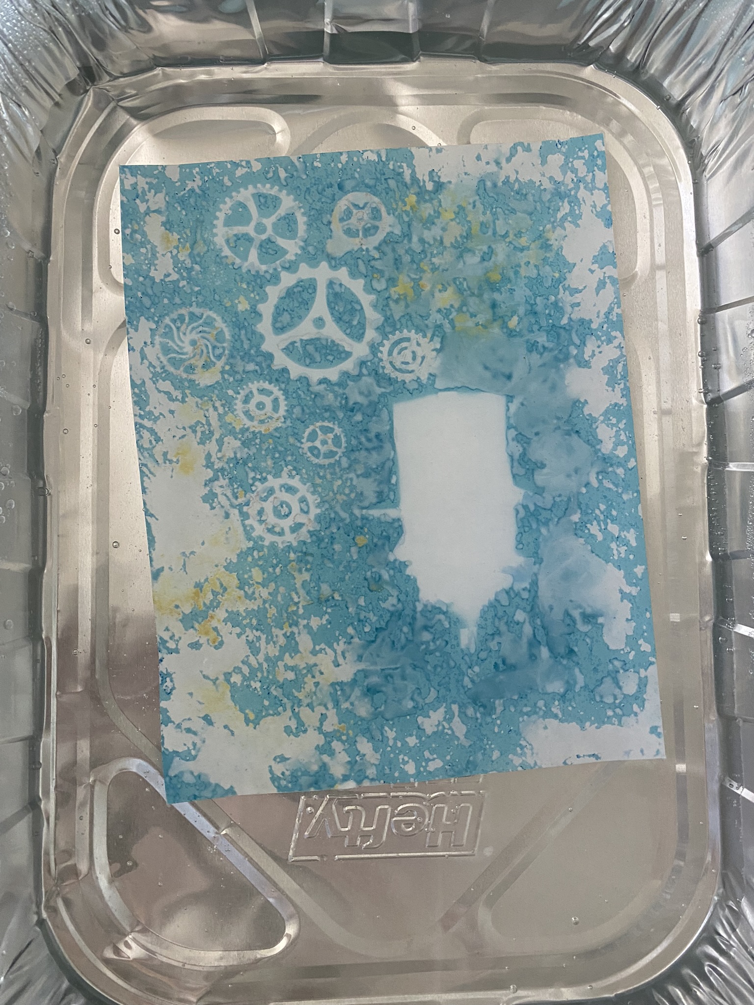 - Before you expose the paper to the sun: you can spray it lightly with water and try different “add-ons”. I found the water spray created spots, in some cases desirable, in others not. I tried spraying diluted vinegar (didn’t quite work), sprinkling Turmeric (this did work), sprinkling Paprika (nope), rock salt (not sure), putting clumps of soap suds (definitely no – it just created white “clouds” on the paper), adding crinkled plastic wrap on top before the acrylic overlay (sometimes) and on top of the acrylic overlay (nope), and finally sprinkling baking powder (yes- if you like the acid-washed denim look). I don’t think many of these treatments worked well for this type of chemically treated paper. I will revisit them when I work with applying cyanotype chemicals to water color paper.