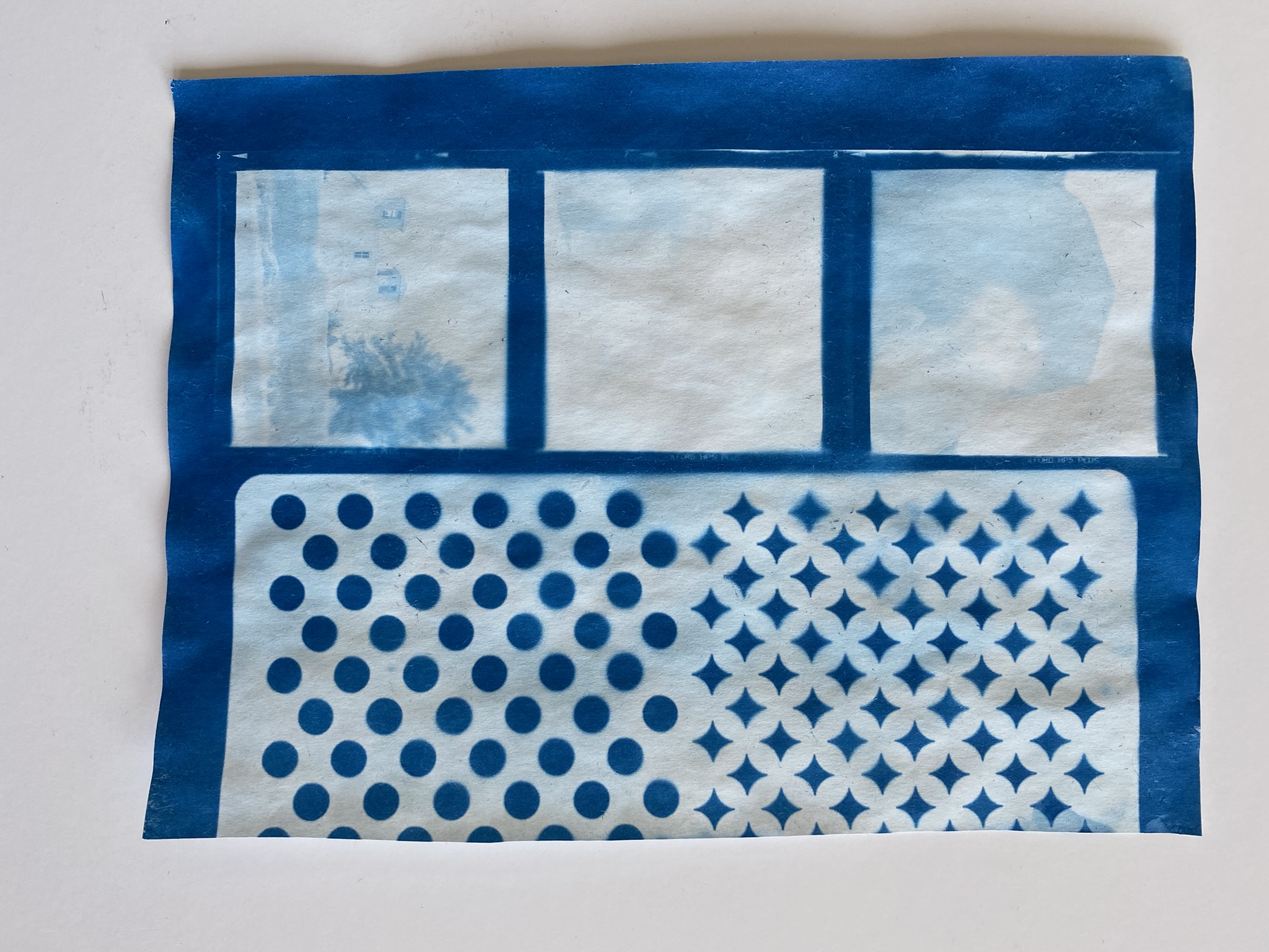 Now the fun begins. What to place on the pretreated paper to create your Sunprint? You will want to look for things that will lay flat when sandwiched between the paper and the acrylic overlay. I started with cuttings from our yard, progressed to cutouts using paper and then the glossy advertisements that appear daily in the mail (paper was too thin and the sun penetrated through the cutout), then stencils, next up was a negative from the film camera I used a few weeks ago (not contrasty enough), and finally a digital negative. I ended up taking the kit with me on the road and tried a few botanicals as we were traveling through different environments.
