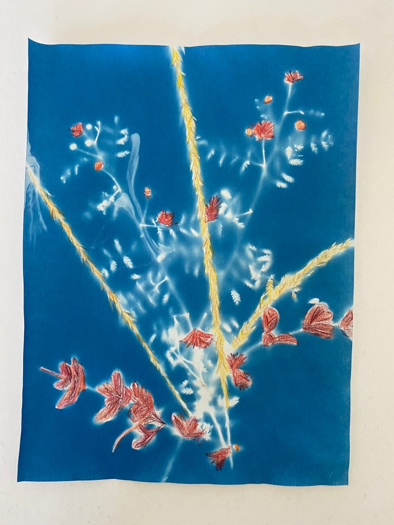 - After drying: I thought I would add some additional color to my first Sunprint. I had too many large chunks of white where my object did not make a particularly interesting shape. I used color pencils to fill in some of the forms, leaving other white.