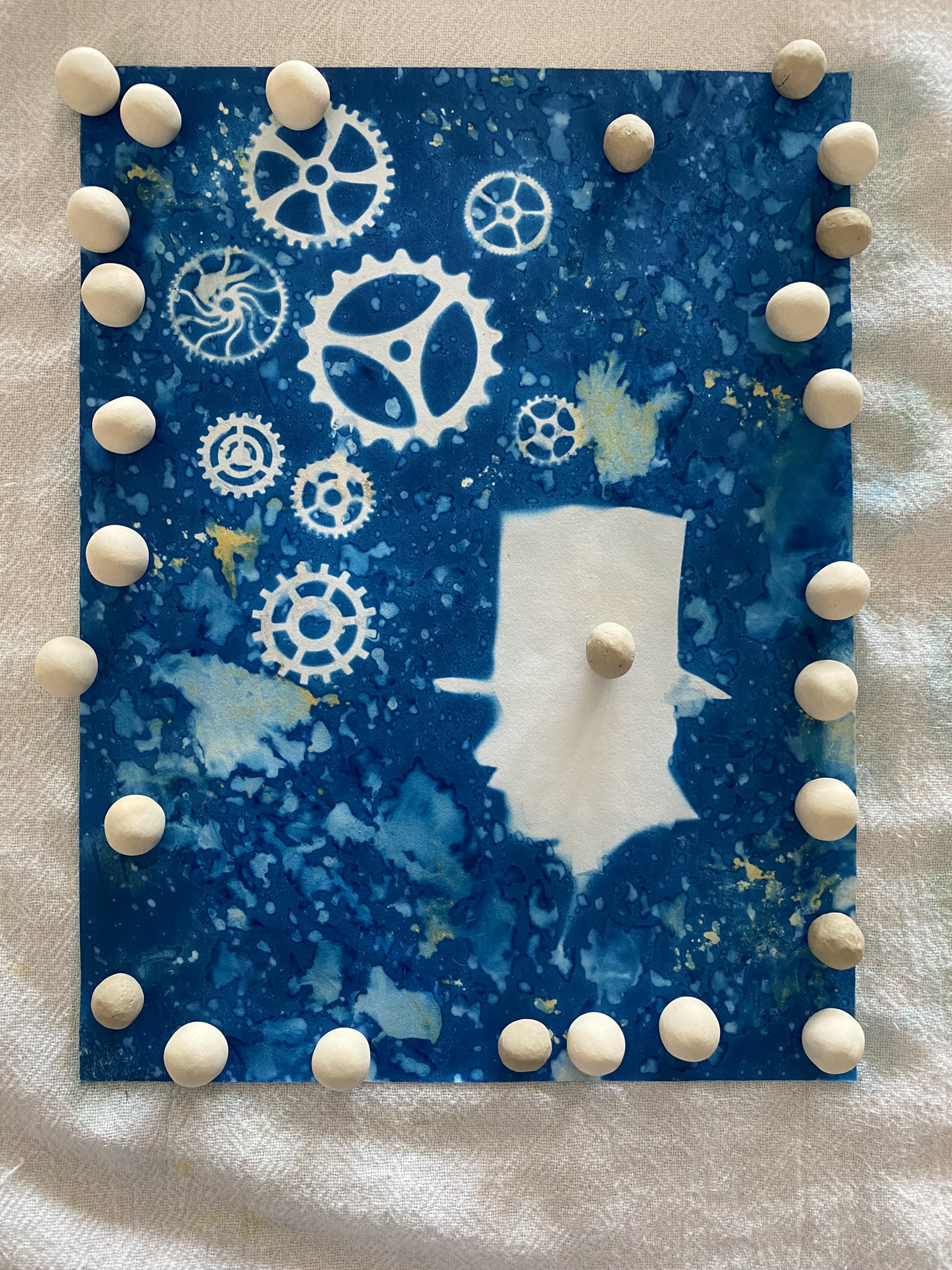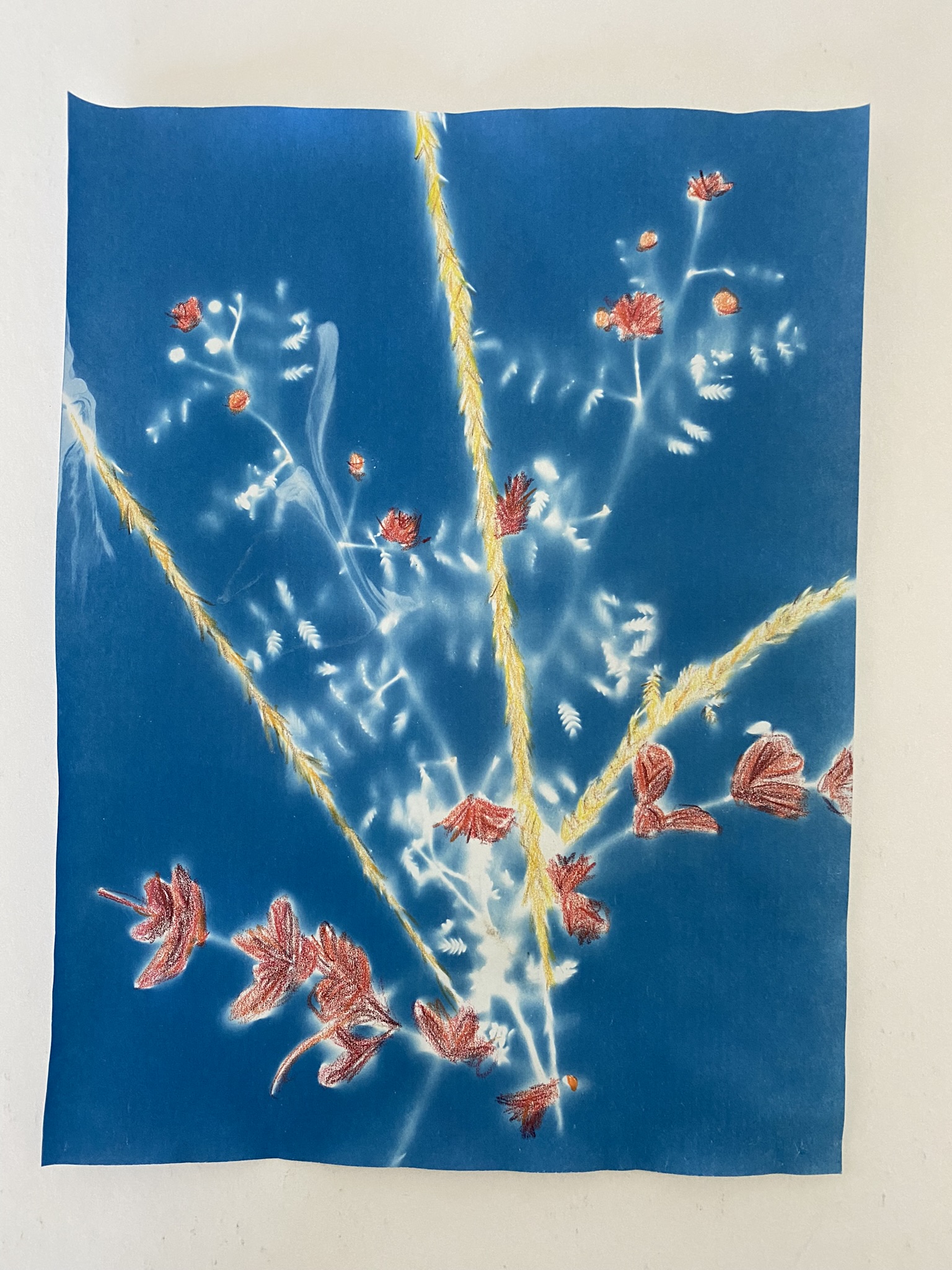 - After drying: I thought I would add some additional color to my first Sunprint. I had too many large chunks of white where my object did not make a particularly interesting shape. I used color pencils to fill in some of the forms, leaving other white.