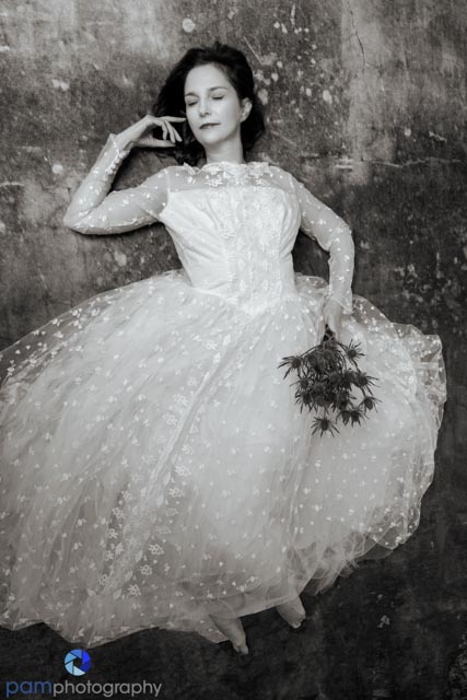 I started finding handmade wedding dresses at Goodwill and wondered what they would be like as subjects for my encaustic wax projects. This image was shot from above while I was laying down on the cold hard floor. My arms and legs were bent at uncomfortable angles in an attempt to convey a feeling of relaxation. A reminder of what people go through to create a visual statement.